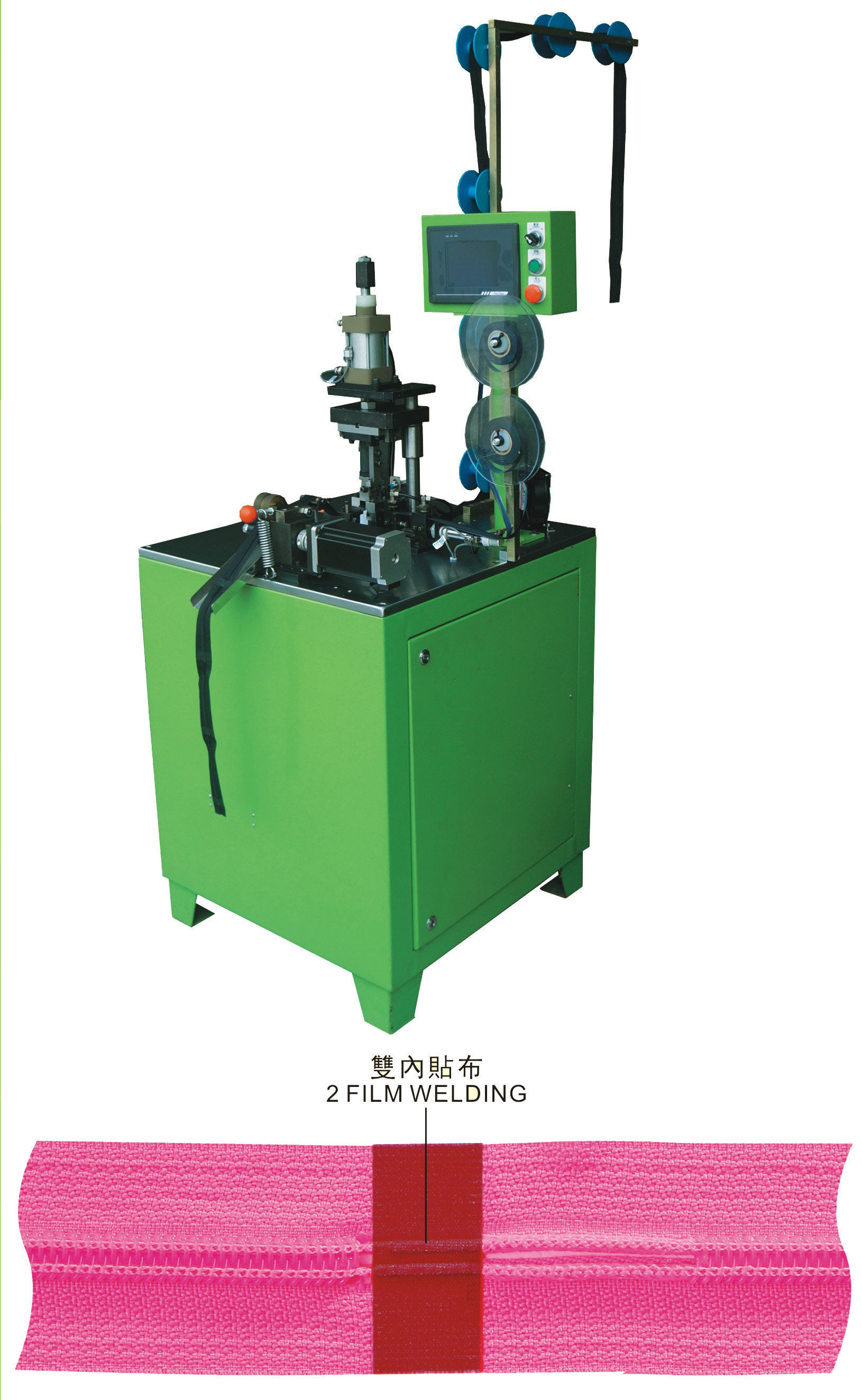 此机的功能是将定好寸修好齿的拉链进行全自动将胶膜送出切断并熔接贴合在开口端拉链的功能。