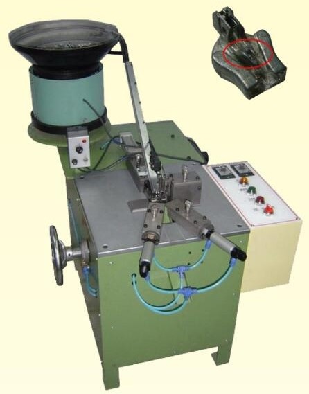 利用振動盤,將拉頭排列經由軌道下料進入,針對隱形拉頭布縫插修(去毛)。